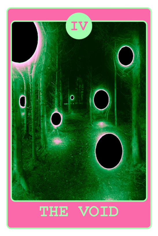 The void says, “Helloooooo,” with zipped lips, eyes shut. To stare into the void is a mirror. The whispering you hear is yourself—offerings from the beyond of your own understanding.The void isn’t here to deliver anything. It is a blank canvas, a tunnel, a bag for shuffling. The void is the hand holding the swirling dice before they emerge, totaling up to seven, nine, twenty-five. Every number is lucky to somebody.The void in all her absent glory is you and me. Not deep inside, just is. You stare at me, I stare at you, and we are a black hole of being: siblings, parents, jobs, grievances. The stuff that’s held and stretched across time. This is called a life.The void is over you. And under. The void sings the song stuck in your head. Write it down or you’ll miss it. The void is tired. The void is so, so tired.The void is calling. It is time to be nobody again. If you could stop filling it up with objects and the weighted mass of your importance, if you put down your scheming and plotting and take a second to sit there with it, you can sit inside of it again.